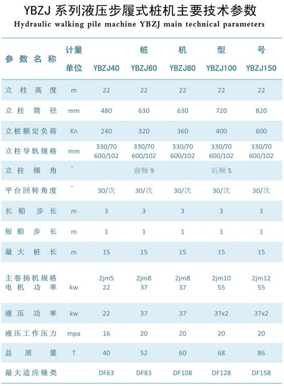 YBZJ系列液壓步履式樁機(jī)是各種基礎(chǔ)施工機(jī)具植村的依靠, 采用船形軌道行走,具有整機(jī)穩(wěn)定性好,功能齊全等特點(diǎn)。根據(jù)施工要求可配導(dǎo)桿式柴油錘、筒式柴油錘、振動(dòng)錘、液壓錘、長(zhǎng)螺旋鉆機(jī)等多種工作設(shè)備。用途廣泛、性能可靠、移動(dòng)方便。